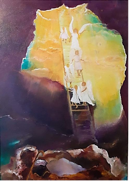 Dit schilderij hangt in mijn coachpraktijk de Jakobsladder. Het is geschilderd door mijn zus en het gaat over het verhaal van Jakob (Genesis 28).